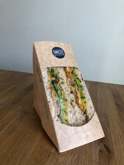 Vegan coronation mayo, homemade onion Bhaji, sweet chilli, leaves, tomato and cucumber on white or granary bread!